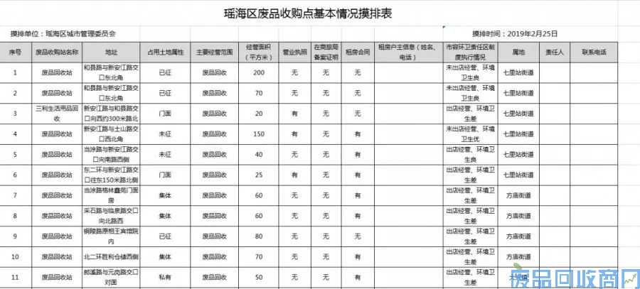调查摸底阶段(2019年3月10日—2019年3月20日),各街镇开发区对辖区废品收购点进行调查摸底,了解并统计辖区内废品收购点的数量、分布情况、占用土地的性质、周边环境卫生和营业执照办理等相关情况,由区城管委汇总后建立工作台账。