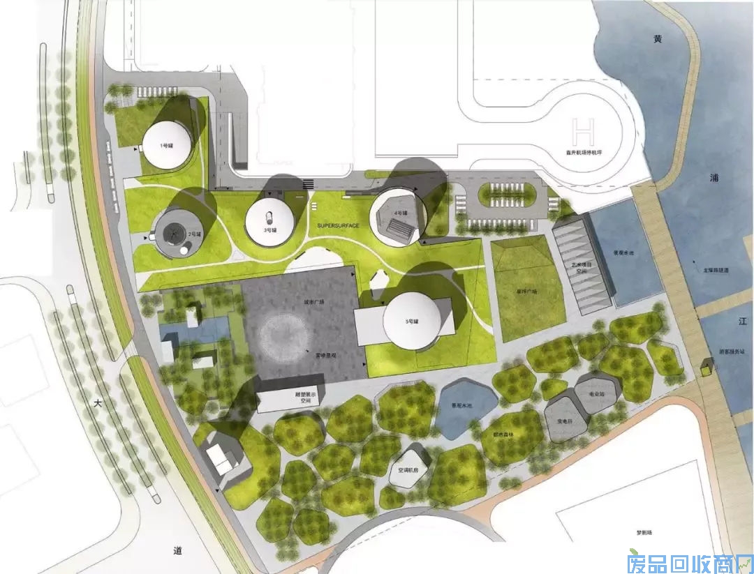 这五个油罐也大有来头,原来之前是隶属于中国最早建成的机场——上海龙华机场(1966年停用)。一个油罐大约有5、6层楼这么高,设计得很有工艺感,想到把废弃油罐变成工艺品,超有sense了吧!