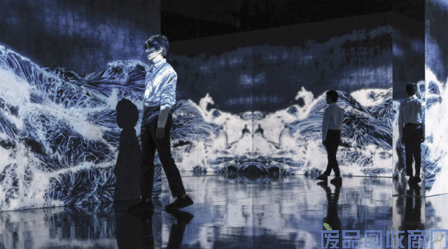 同样是以虚拟的水粒子组成,这个艺术装置模拟的是连续波浪,整个展厅就像漂浮在大海上一般,载浮载沉,景象非常壮阔,而且有点浮世绘的既视感!