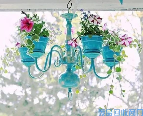 把坏了不用的灯架装上土,养一些垂钓的花草,很漂亮吧。