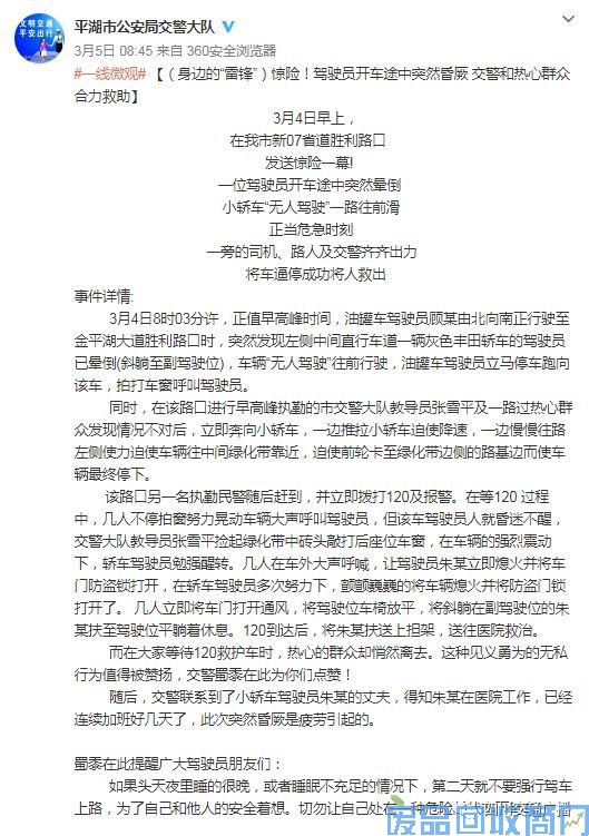 浙江嘉兴交警大队通报:3月4日,一驾驶小轿车的女司机突然晕厥,车辆在“无人驾驶”状态下向前滑行,旁边的油罐车司机发现后,立即下车用身体拦截并呼救。