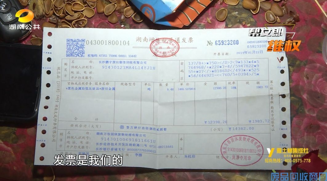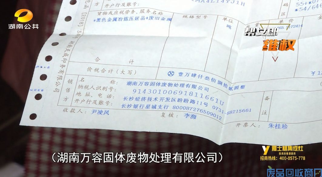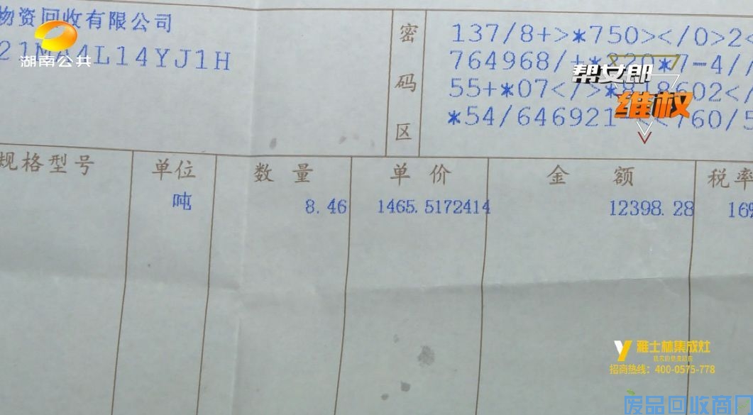 帮助记者从这张发票上可以看到,湖南万容公司是在今年1月22号向废品回收站出售的这批废料,总重量超过了八吨,每吨价格接近一千五百块钱。