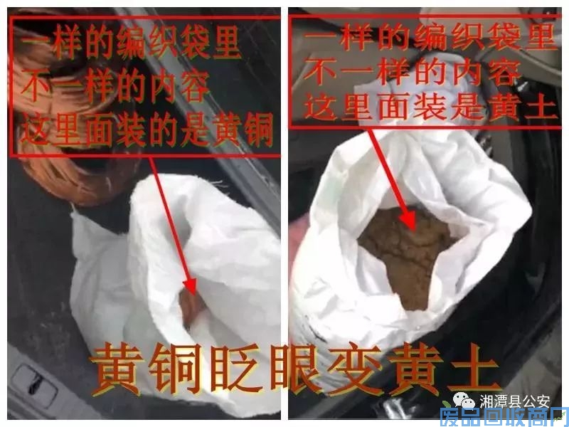 3 月 2 日上午 9 时许,两湖北男子驾驶一台别克轿车在湘潭县 107 国道白石地段拦住一收废品的三轮车,从车上提下一袋黄铜丝要卖给收废品的老人。收废品的打开袋子看了看确认是上好的黄铜丝,于是老人也未加多想拿就起来便称重,随后付了 1210 元货款。谁知到家一打开口袋,里面倒出来的竟然是黄泥巴。