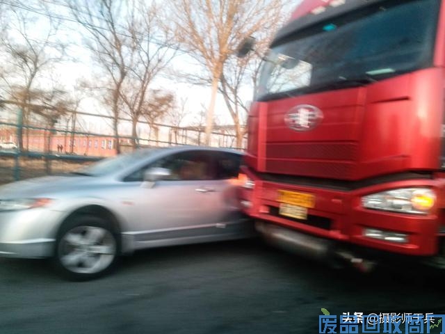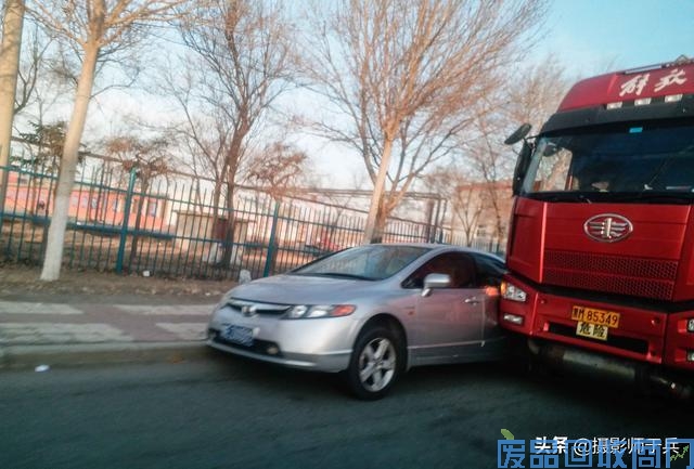 事故疑似油罐车司机右转时候,倒车镜没有看到下面的小轿车,发生上面挤刮事故。