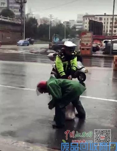 事情发生在2月17日上午10时许,在新余市劳动立交桥下站前西路延伸段,一名拾荒老人推着三轮车,车上收集了许多废品,因路上湿滑,不小心将车上的废品撒了出来,有一件玻璃制品掉落地上打碎,老人恐怕路过的车辆、行人有危险,便低头捡拾,正巧巡逻至此处的新余城南交警大队协警熊赟看到老人这一举动后,立即上前并弯下腰帮助老人拾起玻璃碎片。