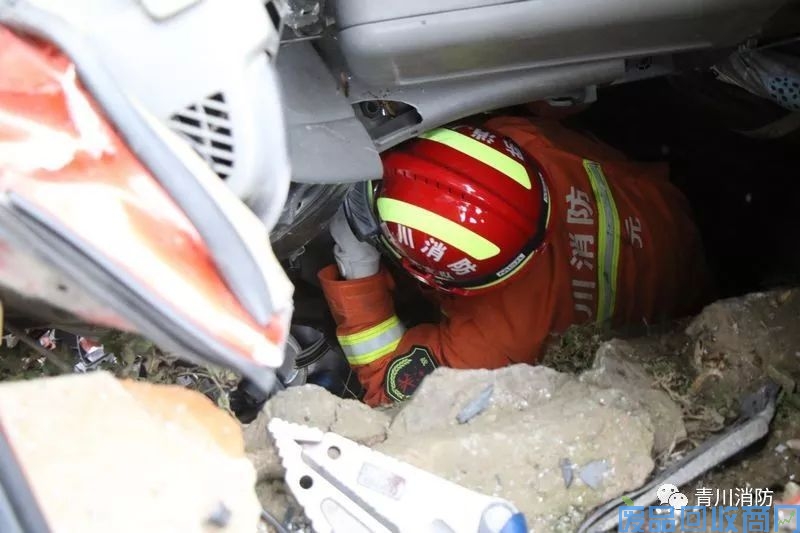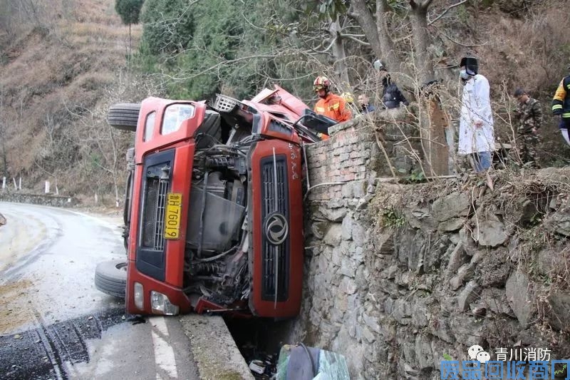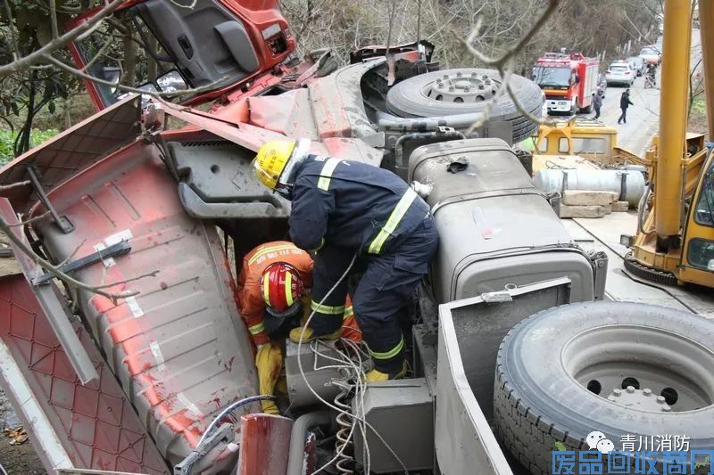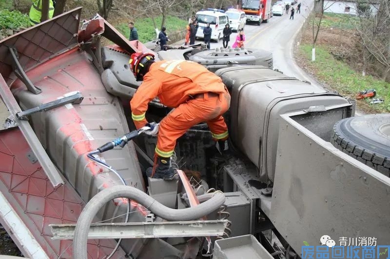 到达现场后,经询问现场交警得知,该水泥罐车车牌号为鲁H7G019,载有30吨左右的水泥,由青川县姚渡镇方向往青川县沙洲镇方向行驶,在行驶过程中因弯道急,车辆速度较快导致车辆侧翻。随后,经侦察发现该水泥罐车车侧翻于路边,车头严重变形,驾驶室有2人被困,经120医务人员确认均无生命迹象。指挥员在了解基本情况后,立即下令:一是对现场实施警戒,严禁无关人员靠近;二是在吊车的配合下利用液压破拆组对驾驶室进行破拆以及深入的扩张;三是出一支水枪对车辆油箱进行冷却,以及泄漏的机油、柴油进行冲刷、稀释,命令下达后,中队消防员按照下达的命令展开救援。经过4个小时的努力,成功将被困人员救出,并移交现场派出所民警处置.