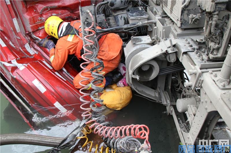 随后,救援人员迅速制定救援方案,第一小组穿戴好个人防护装具乘坐橡皮艇在事故车辆上查看是否有人员被困;第二组待确定人员被困位置后寻找可开展救援的位置对驾驶室进行破拆、扩张。由于河水浑浊、水位过高,中队救援人员无法寻找到可供扩张的支点,经过反复勘察,指挥员命令救援队员从车窗位置涉水深入驾驶室内部进行救援,救援队员在河水中经过两个小时的救援,成功将第一名被困人员救出。由于第二名被困人员被卡在驾驶室内,救援人员在水面上无法将其救出,随后联系吊车将事故车辆起吊至路面,救援人员在吊车的配合下,于20时50分左右将第二名被困人员救出,经现场120医务人员确认已无生命迹象。