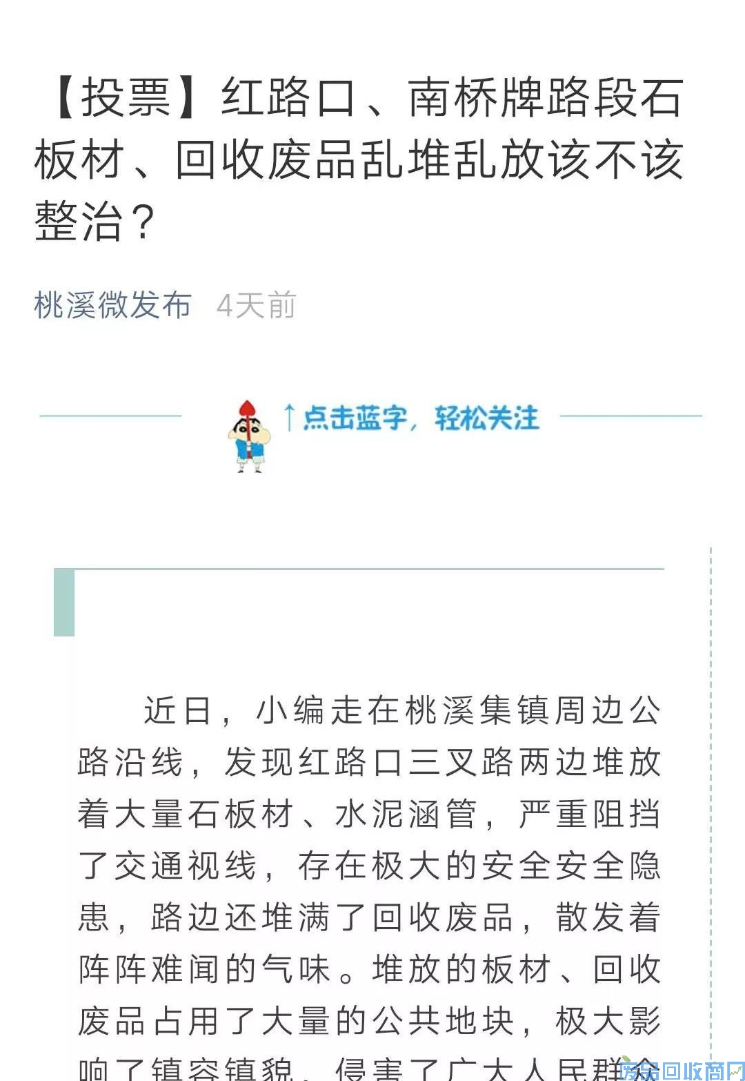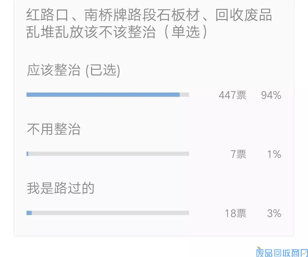 原标题:红路口、南桥牌路段石板材、回收废品乱堆乱放该不该整治?投票结果:94%支持大力整治