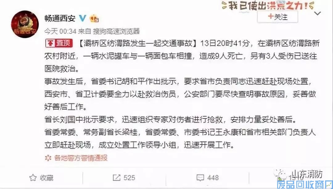 11月14日凌晨,西安市公安局交警支队官方微博@畅通西安 发布消息称,13日20时41分,西安灞桥区纺渭路新农村附近,一辆水泥罐车与一辆面包车相撞,造成9人死亡,另有3人受伤,已被送往医院救治。