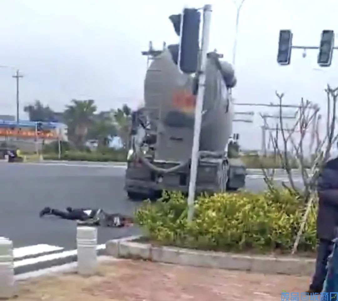 被撞后的女子笔直地趴在水泥罐车身后,一动不动,疑似头部伤势严重。生命顷刻间就没了,愿逝者安息