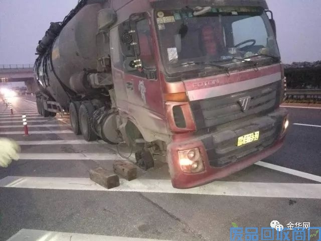 原来胡师傅驾驶这辆水泥罐车,本是打算去兰溪拉水泥。在行驶过程中,胡师傅也发现车子有点晃,但检查过又没发现什么问题,于是胡师傅选择了继续行驶,当车子行驶在甬金高速金华方向佛堂收费站互通位置时,突然发现自己的轮胎滚落,胡师傅选择了平稳刹车控速,当场火花四溅,场面十分惊险。由于滚落的是车头的右前轮胎,车子无法正常行驶,只能停靠在主车道和硬路之间。
