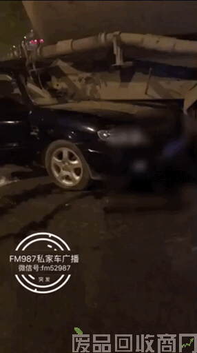 黑色小车前半身几乎全部钻进水泥罐车尾部,驾驶舱被撞到面目全非,弹出的安全气囊上还有血渍...