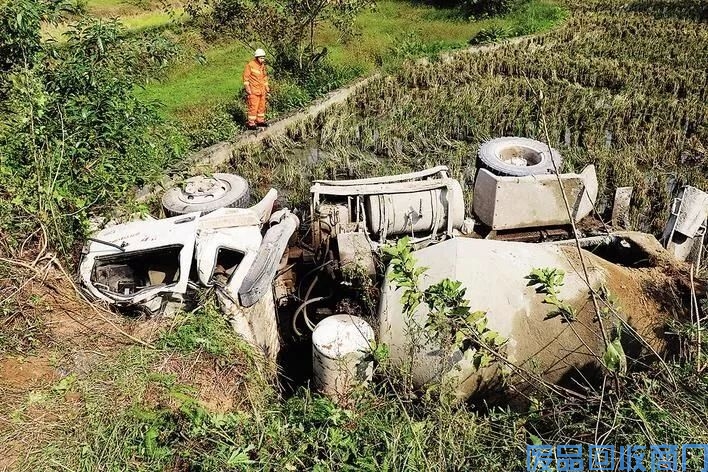 事故地点距离响石收费站约一公里。消防员到达现场时发现一辆水泥罐车侧翻在水田里,围观群众已经在设法营救车内被困人员了。
