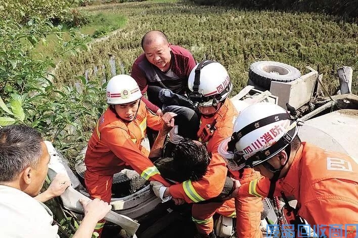 11月3日11时,隆昌市往黄家镇方向的公路上,一辆水泥罐车在与其他车辆会车时因道路狭窄,侧翻在路旁的水田里,致使驾驶员被困,情况十分危急。