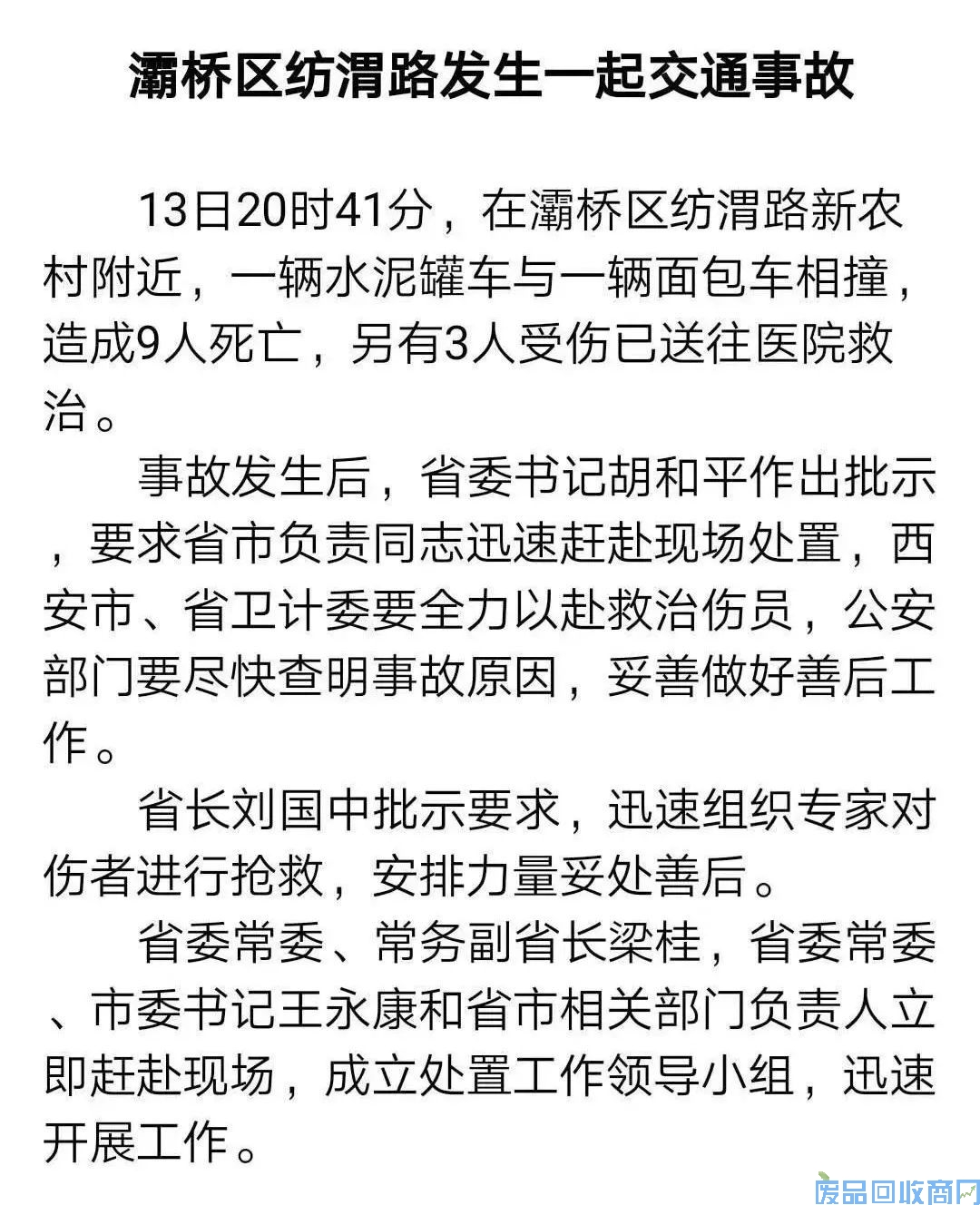 11月13日20时41分,在灞桥区纺渭路新农村附近,一辆水泥罐车与一辆面包车相撞,造成9人死亡,另有3人受伤已送往医院救治。
