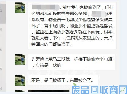 业主抱怨:物业费一毛都没少交,物业合同上写夜间保安半小时巡逻一次,却没看到有人巡逻,在该小区电瓶被偷,已经发生过多次。
