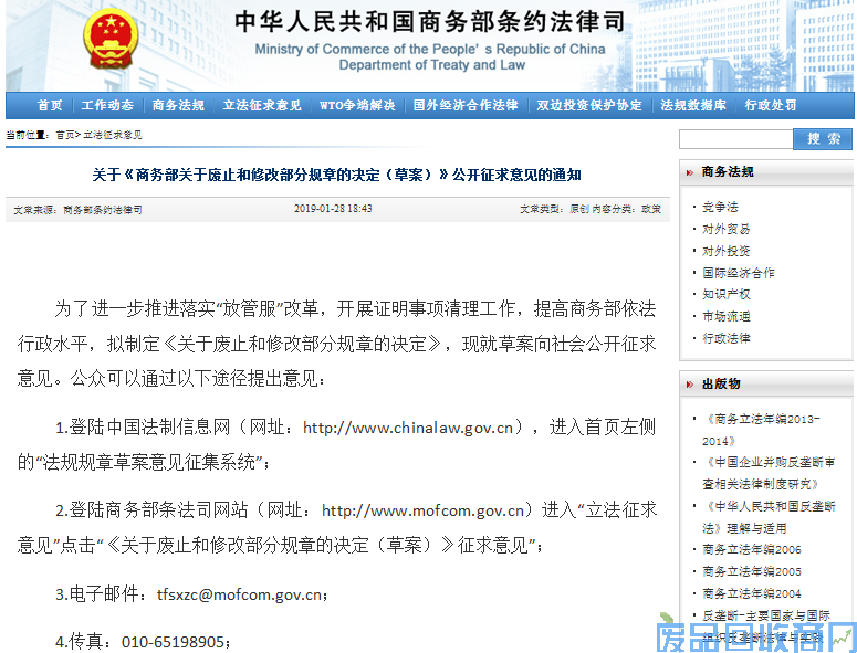 2月28日,国家商务部条法司发布了《废止和修改部分规章的决定(草案)》(以下简称《决定(草案)》)公开征求意见的通知,征集时间截至2019年3月2日。
