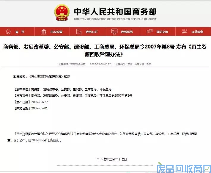 早在2007年,商务部、发展改革委等6部门发布《再生资源回收管理办法》,明确商务主管部门作为再生资源回收行业主管部门。