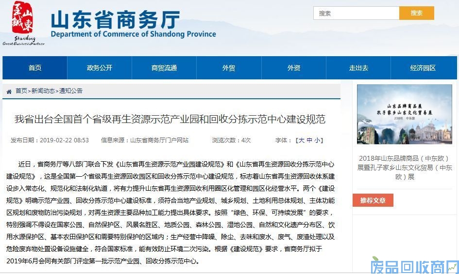 山东省商务厅、生态环境厅等八部门近日联合下发《山东省再生资源示范产业园建设规范》和《山东省再生资源回收分拣示范中心建设规范》,成为全国首个省级再生资源回收园区和回收分拣示范中心建设规范。