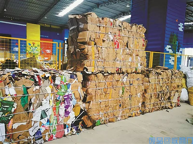 位于姜山镇的再生资源分拣中心内,废纸板打包待运