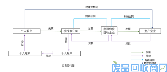 此种交易模式下,为了证明交易的真实性,回收企业往往还需拟定与被挂靠公司的交易合同、收付款凭证、过磅单等材料,在形式上将货款支付给“被挂靠公司”,再通过关联的个人账户收回该笔款项,由此会出现“资金回流”,加之货物系由个人散户直接运送至生产企业,被挂靠公司既不参与货物运输,亦不对货物品种、数量等实施监督,办案机关大都会以票货分离或资金回流追究被挂靠公司、回收企业虚开发票的刑事责任。