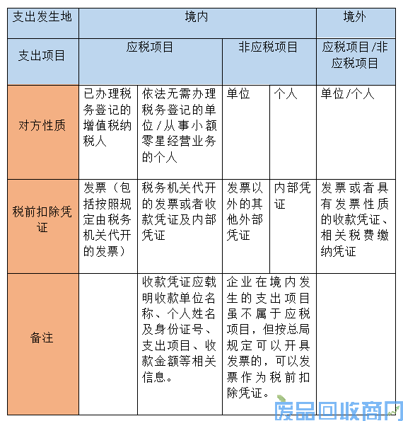 实务中,考虑到废旧物资回收经营的特殊性,部分地区的税务机关允许回收企业通过自印收购凭证开展回收业务,该收购凭证不能做增值税进项抵扣,但可以用于企业所得税税前扣除。如《天津市国家税务局关于加强收购凭证管理有关问题的通知》(津国税征﹝2004﹞8号)规定,我市收购凭证种类分为两种,一是天津市国家税务局统一印制的《天津市统一收购凭证》(以下简称“统一收购凭证”),适用于纳税人直接收购农业生产者自产农业产品时自行开立,用于进项税金抵扣。二是纳税人经国税机关批准印制的《印有单位名称的收购凭证》(以下简称“自印收购凭证”),适用于纳税人收购货物时自行开立,但不能做进项税金抵扣。同时,《天津市国家税务局关于废旧物资收购凭证印制及使用有关问题的通知》(津国税征﹝2007﹞4号)明确,一、回收经营单位收购废旧物资,应按照市国税局《关于加强收购凭证管理有关问题的通知》(津国税征﹝2004﹞8号)及《印制印有单位名称发票管理办法》(津国税征﹝2006﹞17号)要求,必须使用印有单位名称的废旧物资收购凭证,不得使用其它类型的收购凭证。
