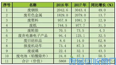 2016-2017年我国主要再生资源类别回收价值表单位:亿元