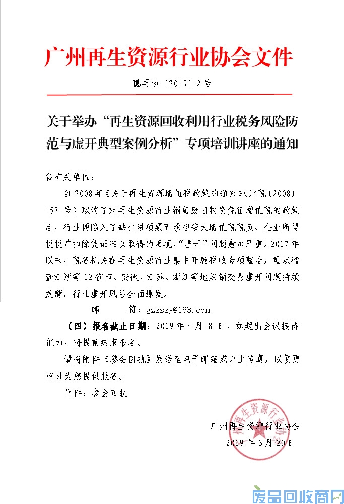 为使广大废旧物资回收经营企业合规合法进行税务管理、加强内部防控和外部风险隔离,有效应对和化解“虚开”问题,华税律师事务所联合广州再生资源行业协会共同推出“再生资源回收利用行业税务风险防范与虚开典型案例分析”专题培训讲座,就新形势下行业经营现状、重点涉税问题、“虚开”风险触发点、税务风险防范等内容进行深度分析,该课程由华税律师事务所资深律师讲授。现将有关事项通知如下: