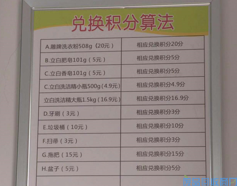 记者在超市收营台附近的墙上看见一张“再生资源积分兑换表”,记者从中了解到,可回收物包括纸张、塑料瓶、玻璃瓶、废旧金属、废旧电器等。其中,纸壳、塑料瓶、废旧金属等物品按单位斤计算,从而获得可兑换的积分,每1积分可兑换1元等值商品,现场兑换所需食品或日用品均低于市场价格。
