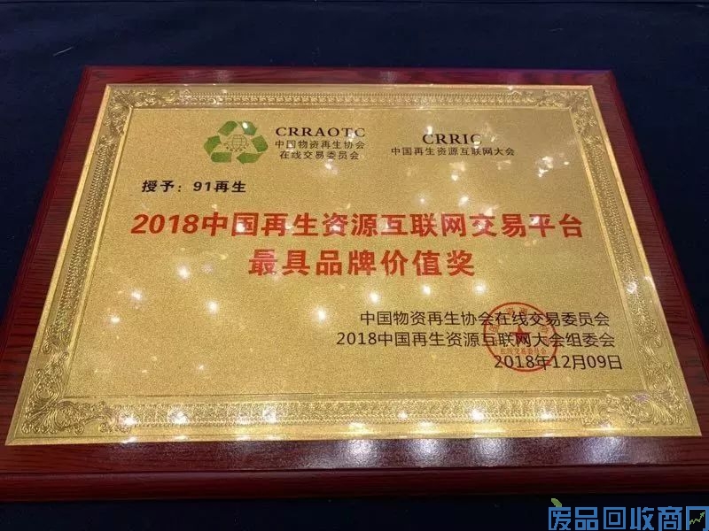 除此之外,会议还举行了“2018中国互联网+再生资源行业颁奖典礼”,91再生荣获中国再生资源互联网交易平台最具品牌价值奖,这是对91再生深耕行业13年的肯定。91再生以其多元化的产业矩阵,精准的供需匹配,得到再生资源行业一致好评。