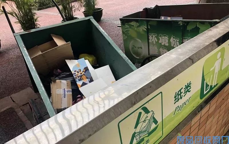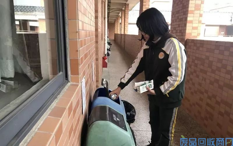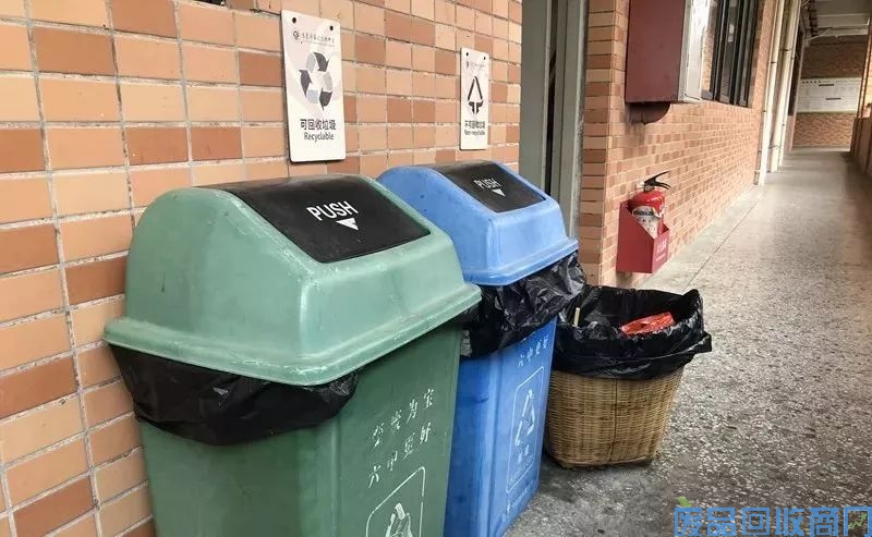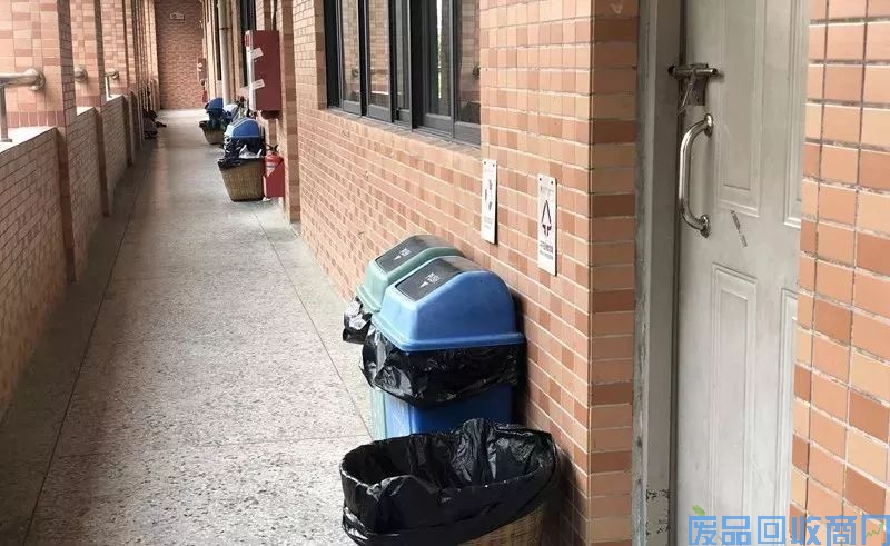 每个班有三个桶,分别用来装纸类、瓶罐类和其余垃圾