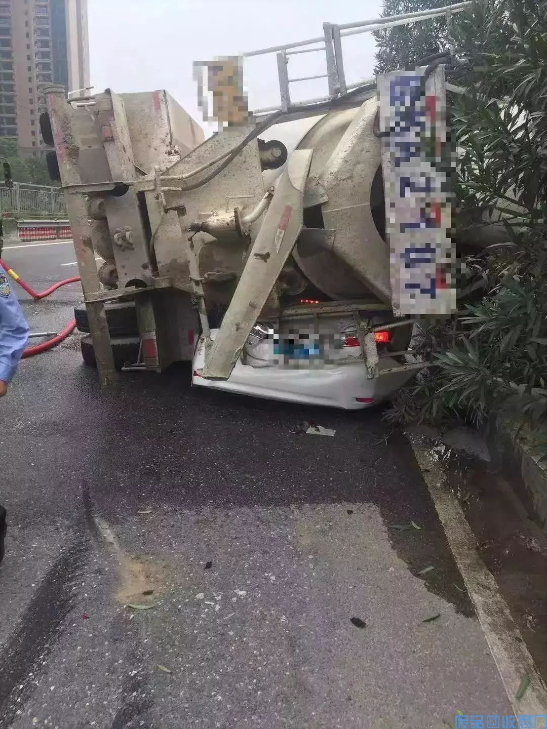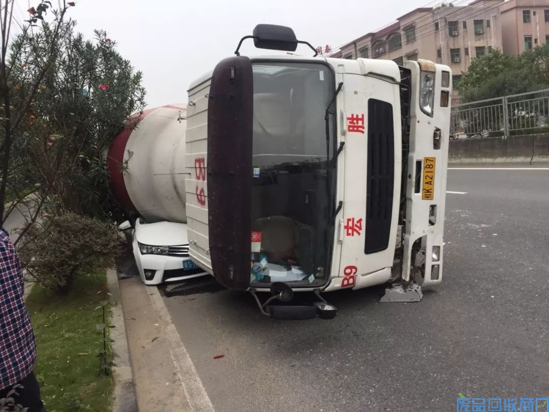 一辆水泥罐车侧翻