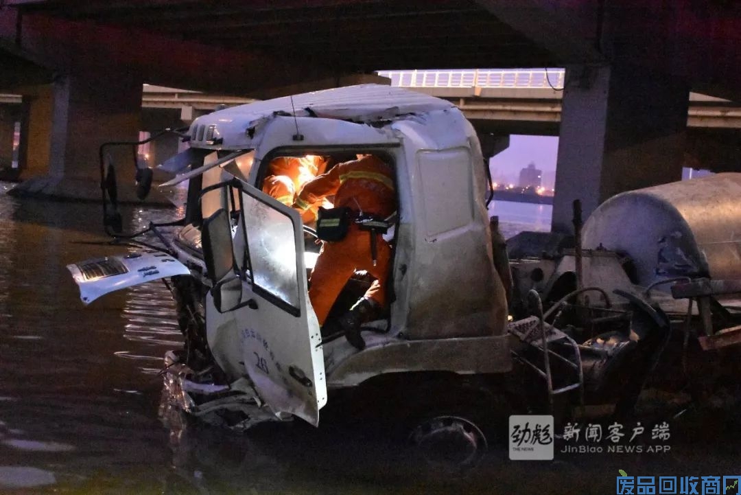 今天凌晨5时10分,在哈尔滨松花江公路大桥北,一辆水泥罐车由于路面光滑驾驶员采取措施不当,车辆失控撞坏桥的护栏冲入桥下,驾驶员被困被爱建中队消防员救出。