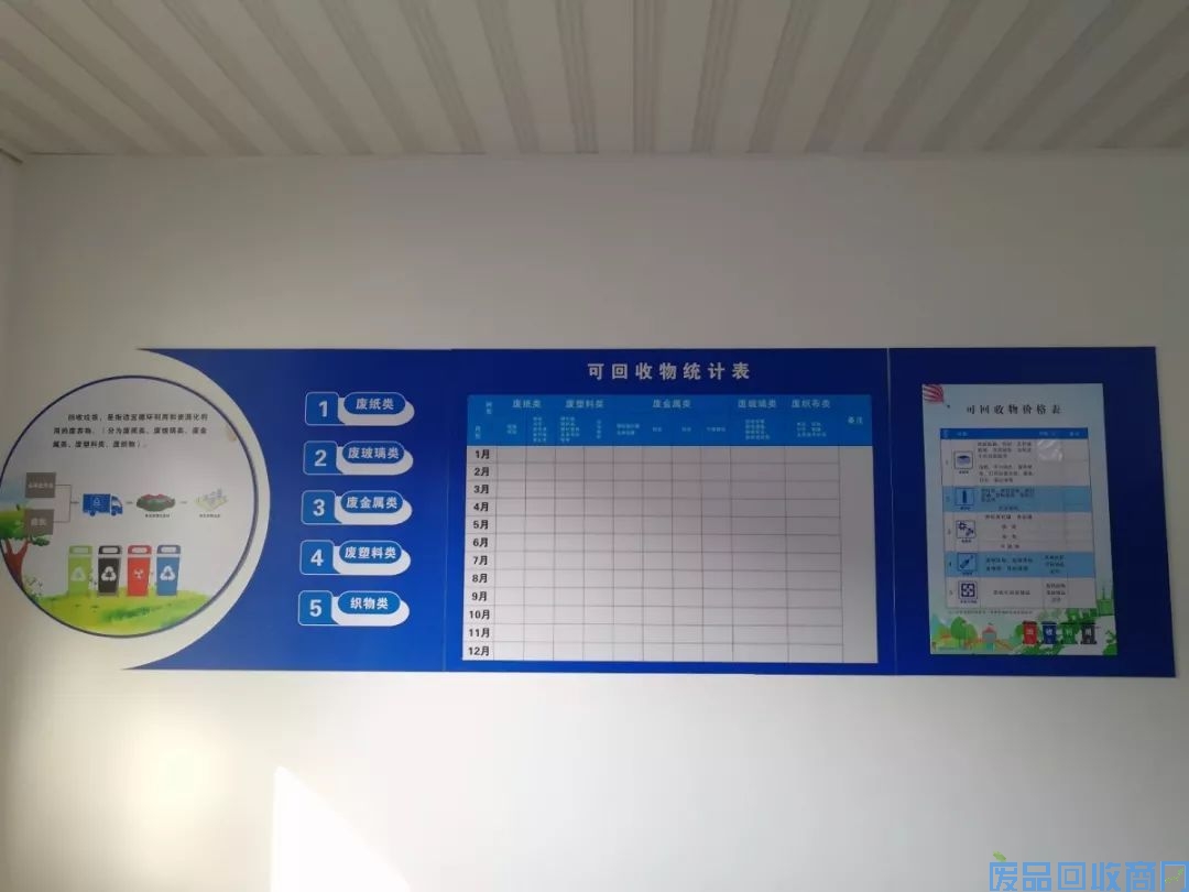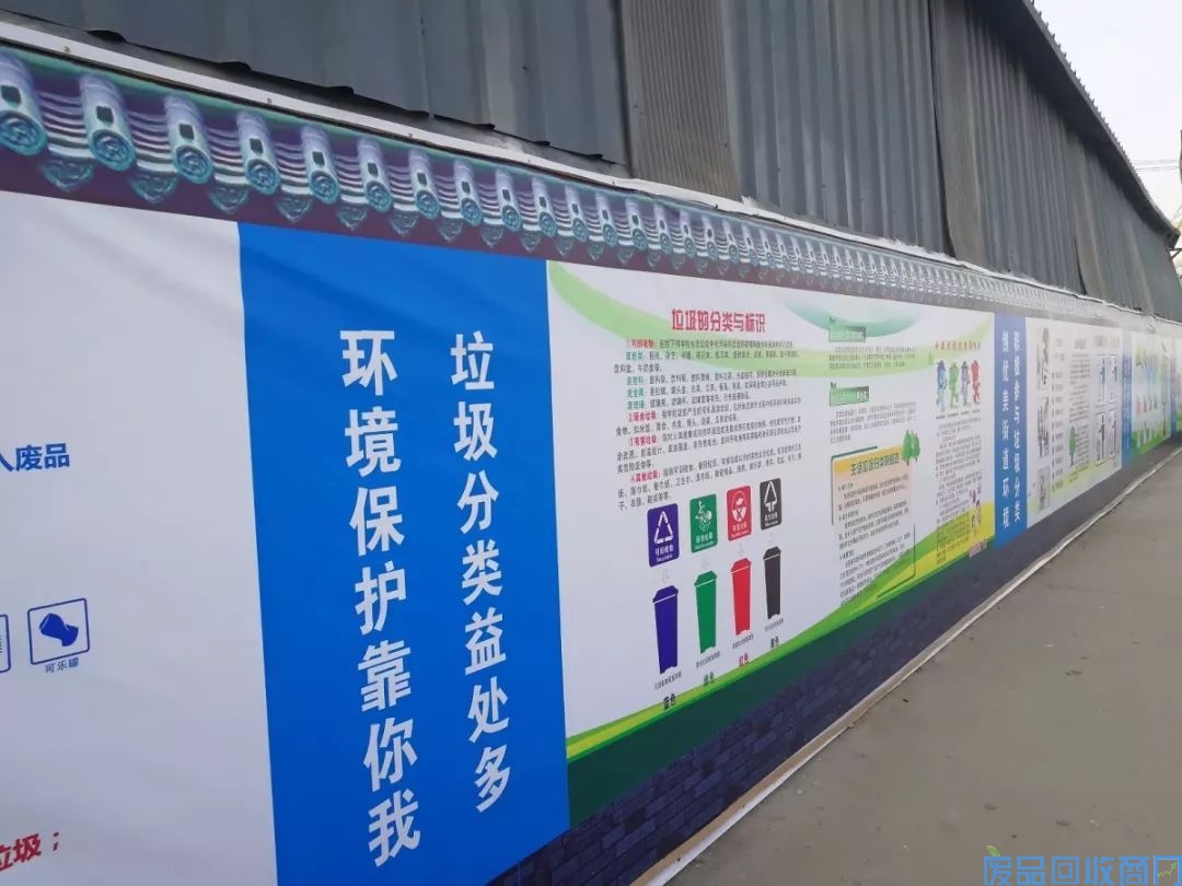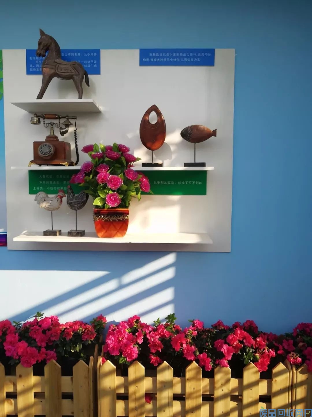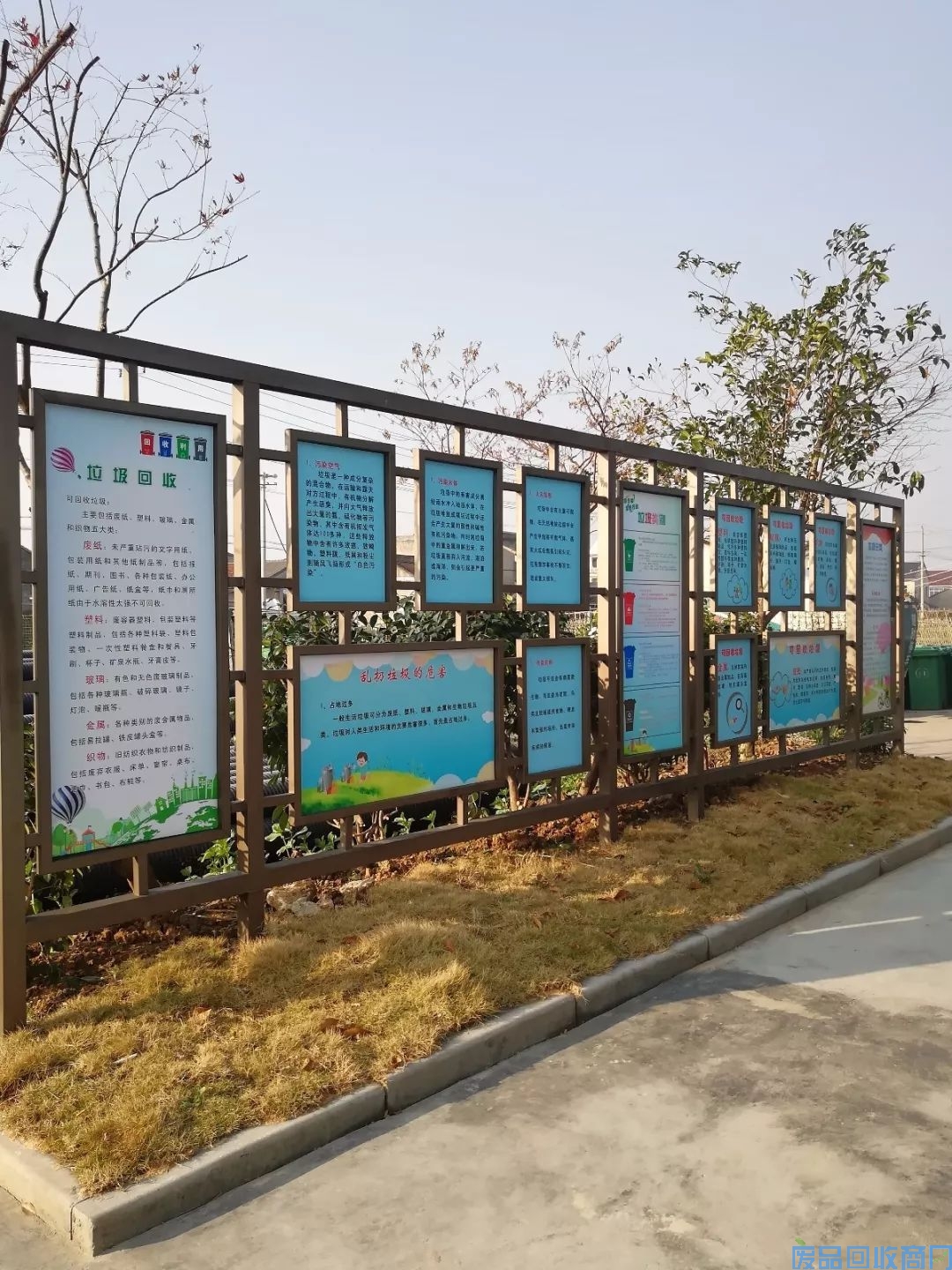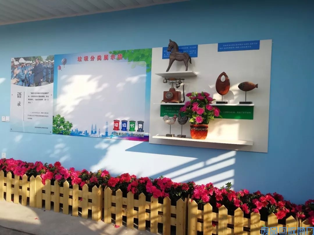 我们在分选站的外墙上设立了垃圾分类展示墙,把各类可回收垃圾进行分类展示,并用具体实物来教会大家如何使垃圾变废为宝。