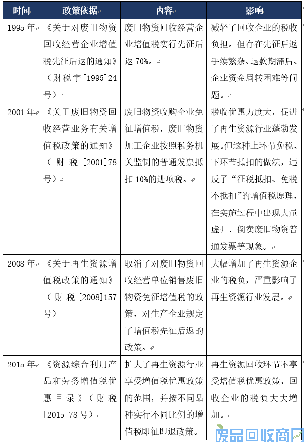 一是回收企业难以取得增值税进项抵扣,导致其税负过重。废旧物资回收企业的原料来源主要包括两大方面:一是从众多的个体户手中收购废旧物资,这种回收方式约占回收总量的80%以上,这些个体人员不能开具增值税发票,回收企业无法抵扣进项税。二是从产废企业购买废旧物资,此种收购比例偏小。在增值税优惠政策取消后,回收企业向生产企业销售物资时,几乎是按照销售额全额缴纳17%的增值税,加上地方附加税费,回收企业的税负远高于一般行业企业水平。此种情形背离了国家鼓励废旧物资回收利用的初衷。