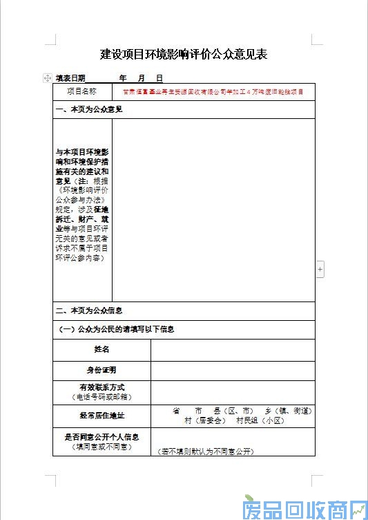 甘肃恒富基业再生资源回收有限公司年加工4万吨废旧轮胎项目环境影响报告书征求意见稿已编制完成,现根据《环境影响评价公众参与办法》(生态环境部004号),对甘肃恒富基业再生资源回收有限公司年加工4万吨废旧轮胎项目征求意见稿进行公示,征求公众对项目的意见。