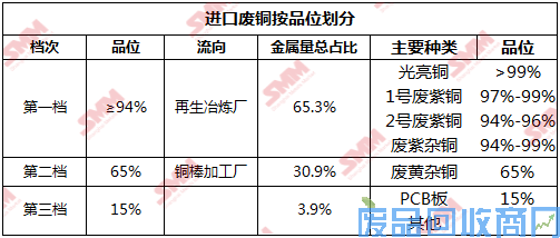 从品位看,进口废铜品位可划分三档,第一档为含铜品位在94%以上的好废铜,包括光亮铜、1号废铜、2号废铜、废紫杂铜,金属量占比约为65.3%;第二档主要为废黄铜,平均含铜品位约为65%,占总金属量比重约为30.9%;品位最低的为PCB线路板,平均品位仅有15%,占比也十分小。