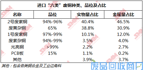 按照以上猜测,要想推断下半年进口废铜的供给状况,资源类划分标准成了非常关键的问题。据此,SMM根据2019年1-2月废铜十位海关数据,对“六类”废铜的种类、品位及占比进行了梳理。