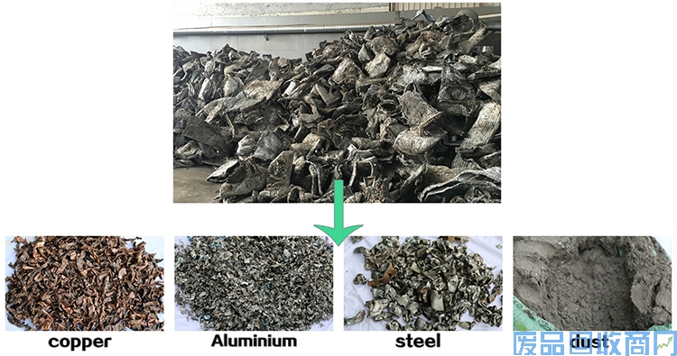 废铜铝水箱散热器怎么处理?可采用干式破碎机、强磁辊筒分选及气流分选机对废旧散热片进行粉碎以及分选。将人工难以拆解或人工拆解需要工费过高的废旧散热片通过铜铝水箱分离机进行处理,得到再生资源。整个处理过程均在负压中进行。首先人工进料预先将里面有大块铁或直径过大的螺丝、轴料等坚硬的物料拿出。再进入一破碎主机进行粗破碎,再次进入二次破碎主机细破碎,让其铝、铁皮、铜等脱落,再后由强磁辊筒及气流分选机将其铝、铁、铜分出。在粉碎和分选过程中配置了脉冲除尘系统,有效地解决粉尘的排放。