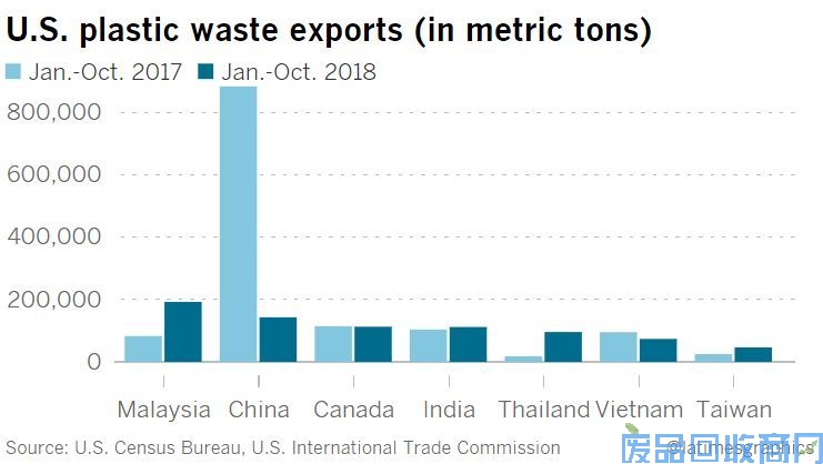 根据联邦政府的数据,马来西亚成为美国塑料废物的首选目的地,2018年前10个月进口量超过192,000吨 - 比前一年增长132%。泰国的废塑料进口量是2017年的四倍多,台湾废塑料进口量是其2017年的两倍。