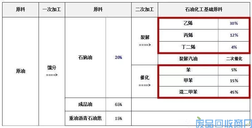 接下来要对分离出的化工轻油中的石脑油部分通过800~1100℃催化、裂解进行二次加工,获得乙烯,丙烯等石化基础原料。