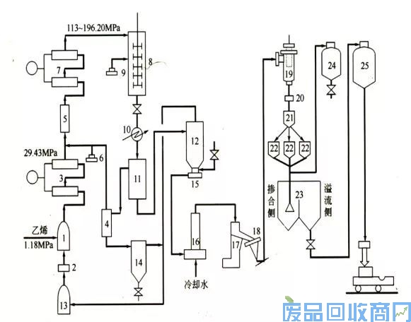 1-乙烯接收器;2-辅助压缩机;3-一次压缩机;4-低聚物分离器;5-气体混合器 6-调节剂注入泵;7-二次压缩机;8-聚合釜;9-引发剂泵;10-产物冷却器;11-高压分离器;12-低压分离器;13-乙烯接收器;14-低聚物液分器;15-齿轮泵;16-切粒机;17-脱水贮槽;18-振动筛;19-旋风分离器;20-磁力分离器;21-缓冲剂;22-中间贮斗;23-掺和器;24-等外品贮槽;25-合格品贮槽。
