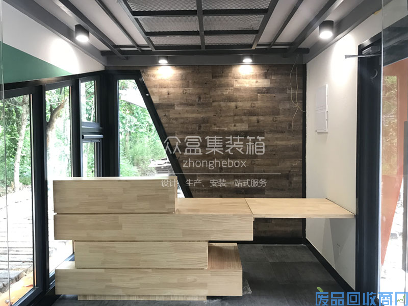 前台设计理念则来源于集装箱的堆砌,然后用实木来现场制作,满足前台功能需要的同时,也充满设计感。