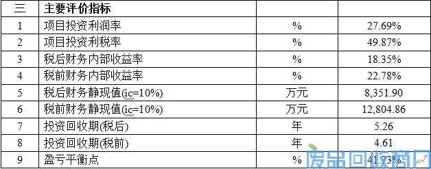 项目建成后,达产年可实现年产值100000.00万元(一期建成后产值10000.00万元,二期建成产值达20000.00万元,三期全部建成后产值为100000.00万元),年均销售收入为80909.09万元,年均利润总额4983.87万元,年均净利润4229.41万元,年上缴税金及附加为362.91万元,年增值税为3629.08万元;投资利润率为27.69%,投资利税率49.87%,税后财务内部收益率18.35%,税后投资回收期(含建设期)为5.26年。