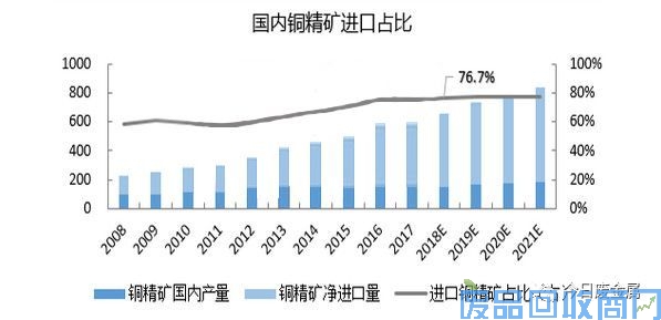 受铜矿资源匮乏牵制,我国对海外进口铜精矿依存度很高,近些年进口铜精矿占比一路攀升。