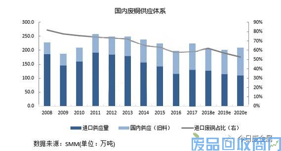 从上述图可以看出,进口废铜占国内废铜供应的一半以上,对国内废铜供给起着重要作用。