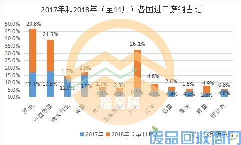 18年我国禁七类对其他国家影响不一,进口减少影响最大的美国和澳大利亚,美国从2017年进口量占中国废铜进口占比15%降到今年的2%,澳大利亚从2017年的12.9%降到今年的1.7%;与此同时进口增加影响较大的有日本和中国香港,日本从2017年的6.5%猛增到2018年的26.1%,中国香港从2017年的17.8%增加到了今年的21.5%。