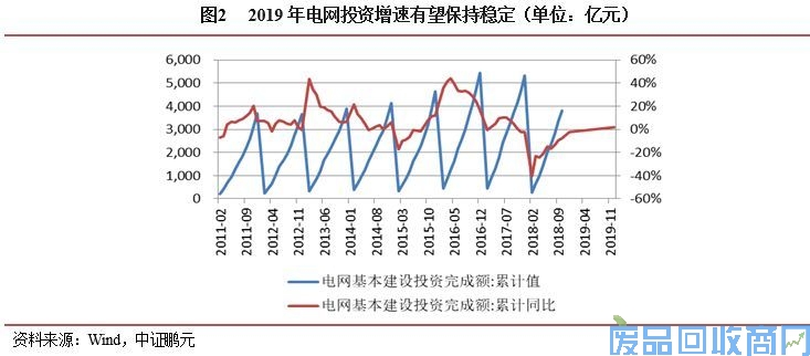 2019年电线电缆回收量有望保持稳定。尽管中小城镇(中心村)电网改造升级等脱贫攻坚重点任务已经完成,而新一轮农网改造升级工程年均投资额仅为1,044.4 亿元(五年计划总投资5,222 亿元),低于2016-2017年1,800亿元和1,474亿元。但在经济下行压力加大的背景下,投资成为稳增长的重要方式,预计2019年电网投资将延续2018年下半年以来的投资力度,电线电缆回收量有望保持稳定。