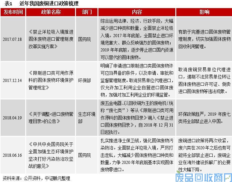 2017年以来,废铜进口限制政策趋严,逐渐由分类管理转向限制进口,最终可能转变为全面禁止进口。旧废铜一般含有杂质,若环保措施不完善,将产生大量污水和有害气体,目前我国对废铜进口实行分类管理,废六类属于自动进口许可废料,废七类属于限制进口许可废料,要进口此类废料需申请进口许可证。2017年7月公布的《禁止洋垃圾入境推进固体废物进口管理制度改革实施方案》提出了全面禁止洋垃圾入境的目标;2018年4月,生态环境部将废七类从《限制进口类可用作原料的固体废物目录》调入《禁止进口固体废物目录》,并将在2018年12月31日起执行,表明2019年起中国将全面禁止进口废七类。