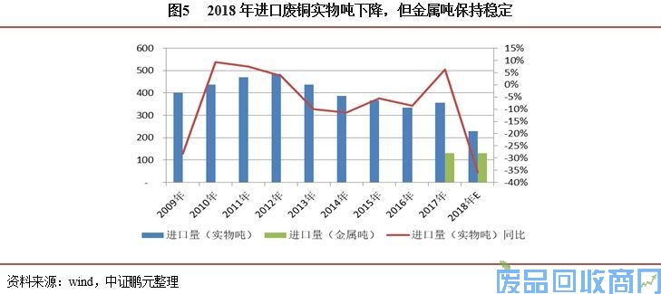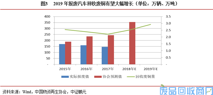 (1)国内废铜供应量有望持续增长。中证鹏元预计2018年中国电线电缆回收量同比有所增长,2019年则有望保持稳定;2018-2019年汽车和电器电子产品报废量将持续增长,是国内废铜供应量增长的主要动力。
